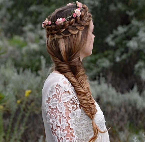 The combination of braids is stunning all on their own. But, adding flowers to the top of the crown braid makes this look a perfect option for any formal occasion. The look is fun because of the contrasting angles between the fishtail and the pulled Dutch braid.